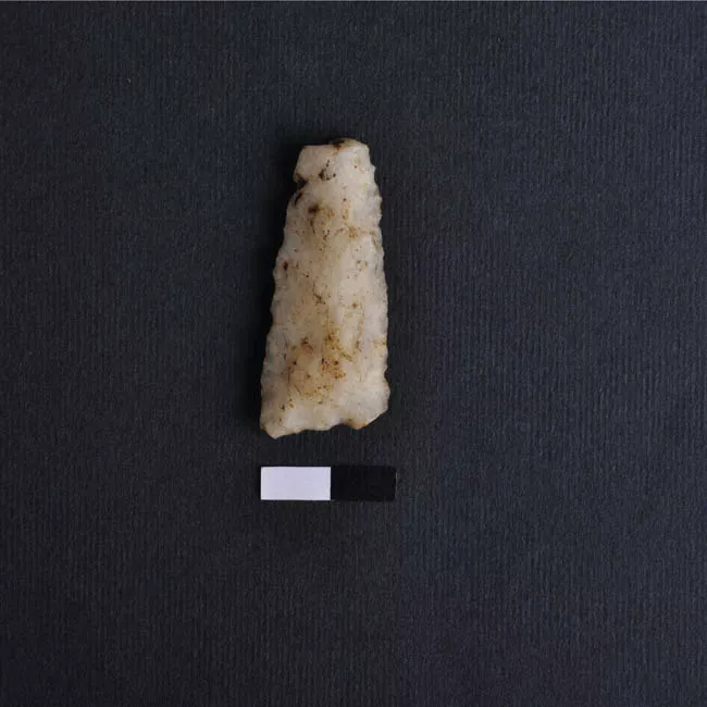 Objeto de forma triangular alargada, de base plana y punta fragmentada...