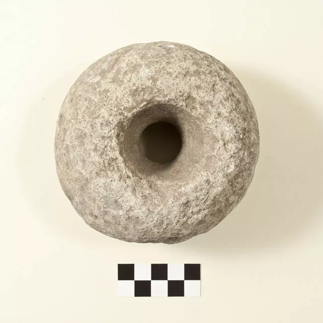 Instrumento lítico de forma esférica achatada con bordes redondeados y...