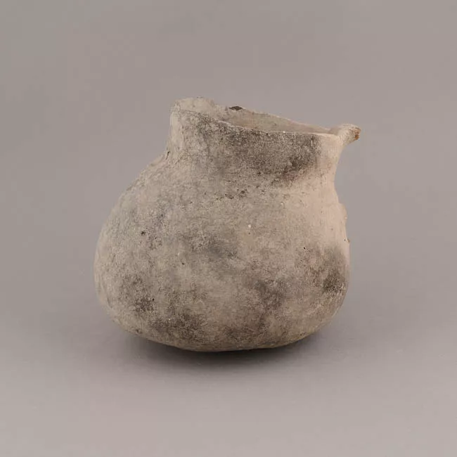 Vaso cilíndrico de boca evertida. En el borde, figura zoomorfa posiblemente alusiva a un lagarto. Superficie alisada sin decoración.