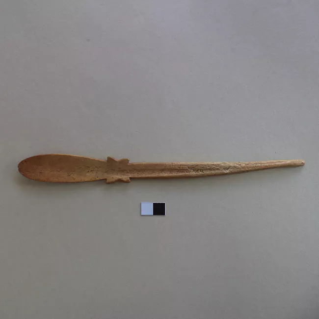 Objeto tubular de una sola pieza, en uno de sus extremos con boquilla y en la parte media una figura zoomorfa