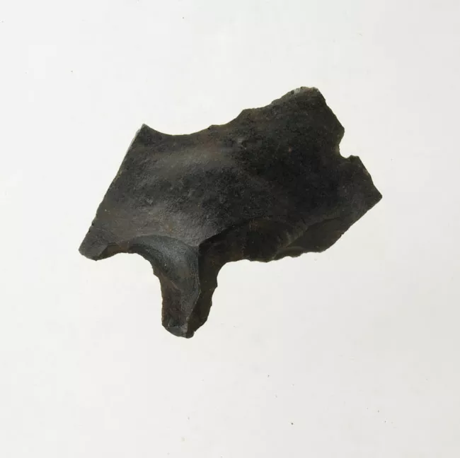 Pieza de color blanco lechoso y de variedad translúcida. Tiene la base escotada y retoque bimarginal.