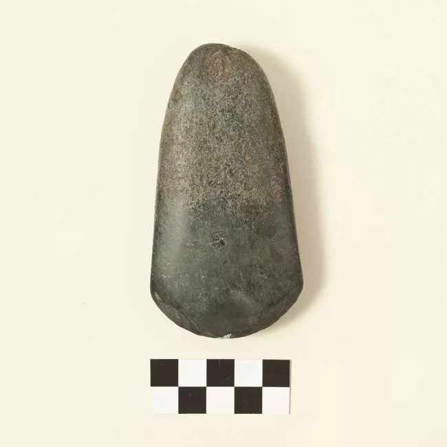 Objeto de uso doméstico de talla bifacial, elaborado en piedra opaca d...