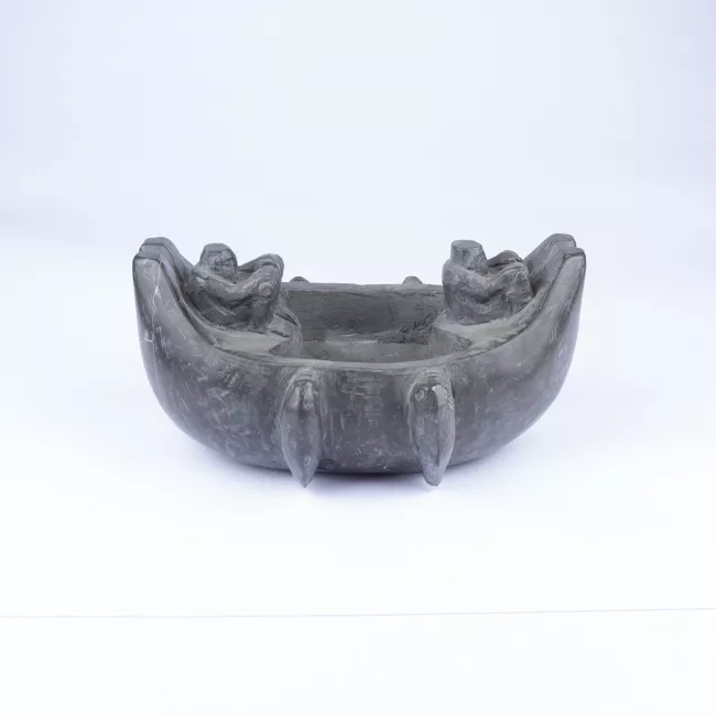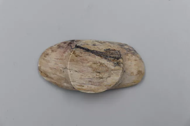 Pieza de forma tubular con una leve curva central, y de color marrón claro. La superficie está pulida. Pieza fabricada de hueso.