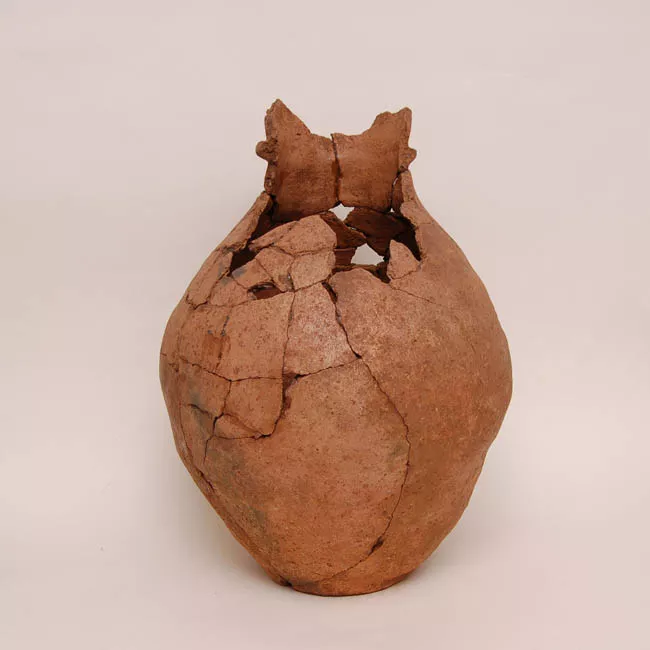 Vasija simétrica restringida con cuello. Cuerpo globular alargado y cu...