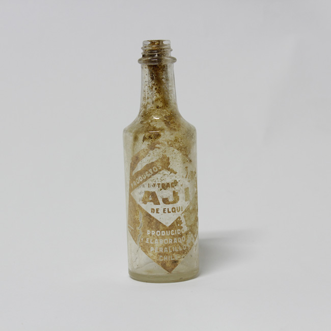 Pieza completa, simétrica, incolora y de variedad transparente con restos de sedimento en su interior. El cuerpo es cilíndrico, los hombros son marcados y el cuello cónico con un anillo redondeado. La boca es estrecha, de labio plano y borde recto con una hélice en espiral para cierre con una tapa rosca. La base es plana y contiene la marca de fábrica de Cristalería Chile vigente hasta los 80’ y a su izquierda el N° 3. Se observan costuras en el contorno de la base y dos laterales que abarcan cuerpo y boca. En el cuerpo se conserva parte de la etiqueta; esta es de forma diamantina, de color blanco sucio y tiene la inscripción “PRODUCTOS ARTOREL M.R./ EXTRACTO/ AJI/ DE ELQUI/PRODUCIDO/ Y ELABORADO EN/ PERALILLO/ CHILE”, En la parte posterior del envase tiene otra inscripción que dice “RES. DEL S.N.S. N°1468/ CAP.125 cc- 24-7-64/2° ZONA LA SERENA”.