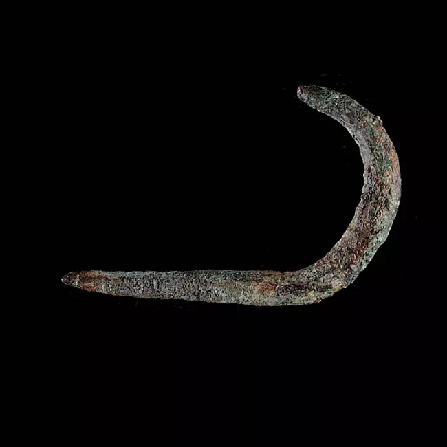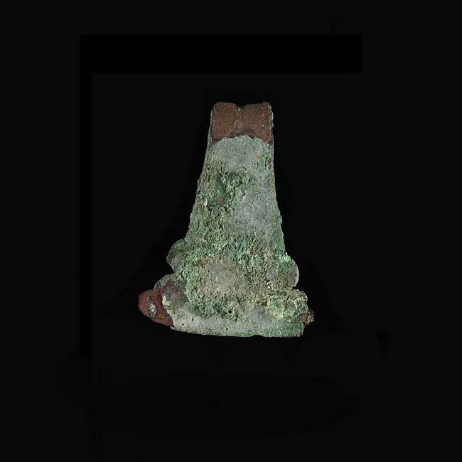 Herramienta compuesta por un mango de madera de sección circular rematado en una manilla y una superficie de trabajo de forma rectangular. Metal y madera de color marrón.