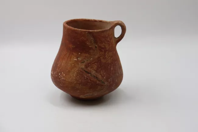Vasija pulida, simétrica, no restringida, simple, con un asa (pero se...