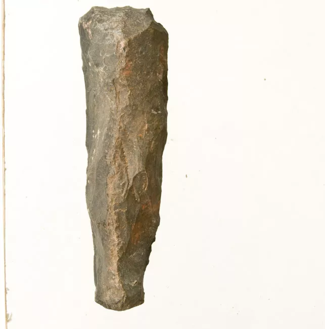Instrumento lítico usado para cortar. Objeto de forma trapezoidal de s...