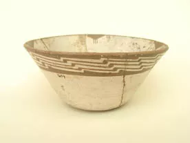 Vasija simétrica, no restringida, de perfil compuesto. El borde es directo evertido con labio convexo, cuerpo troncocónico invertido y base subesférica (con falso torno). Ambas superficies están pulidas; el sector superior de la superficie exterior presenta restos de engobe blanco.