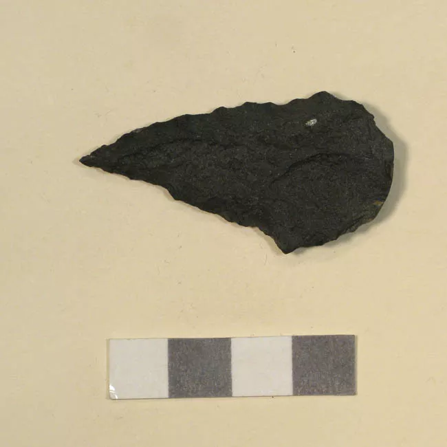 Punta de proyectil de forma triangular. La base de la punta es ligeramente cóncava y presenta unas pequeñas aletas, además de un pedúnculo en su sector central.