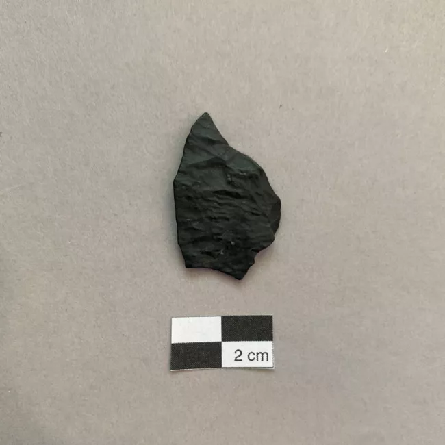 Instrumento lítico de forma general subcircular, de bordes irregulares. Se observa pedúnculo terminado en bisel.