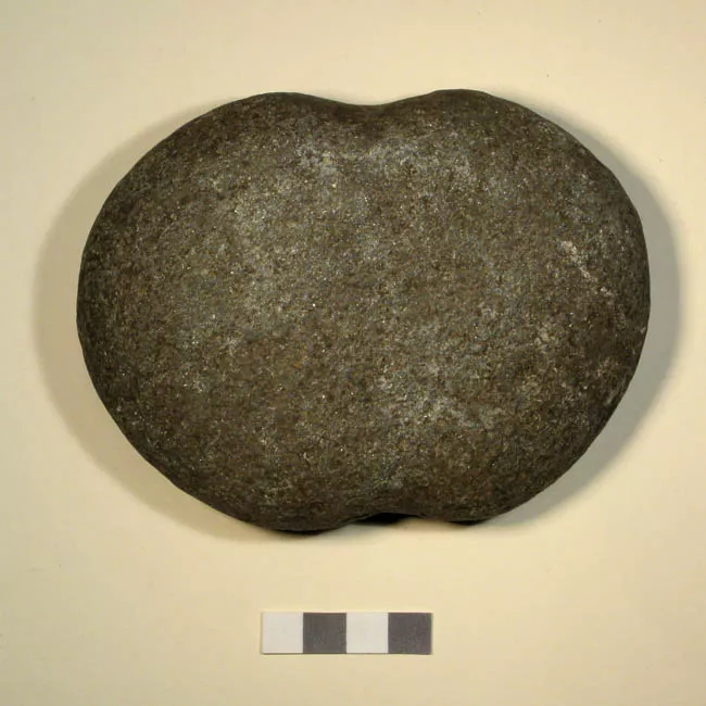 Instrumento lítico compuesto por una cabeza poligonal irregular y un vástago rectangular de extremo redondeado. Se encuentra elaborado en piedra tallada bifacialmente de color negro y gris.