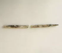Pieza de forma irregular, elaborada en un hueso de ave, presenta un c...
