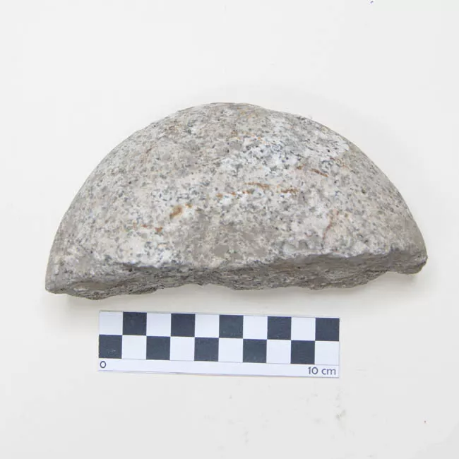 Pieza de color gris con inclusiones blanco lechosas y negruscas. El bo...