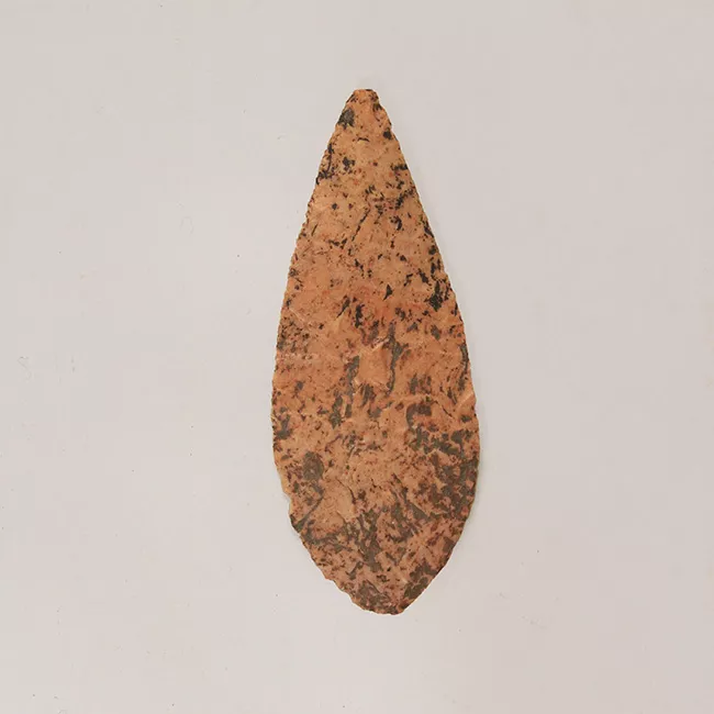 Objeto de uso probablemente ritual. Tiene forma cilíndrica regular y sección plana con bordes redondeados. Está fabricado en piedra tallada rústicamente de color marrón claro con superficie porosa.