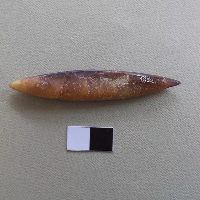 Instrumento usado en la pesca asociado al anzuelo. Objeto de forma ova...