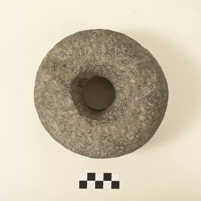 Instrumento lítico con forma esférica achatada, presenta una perforaci...