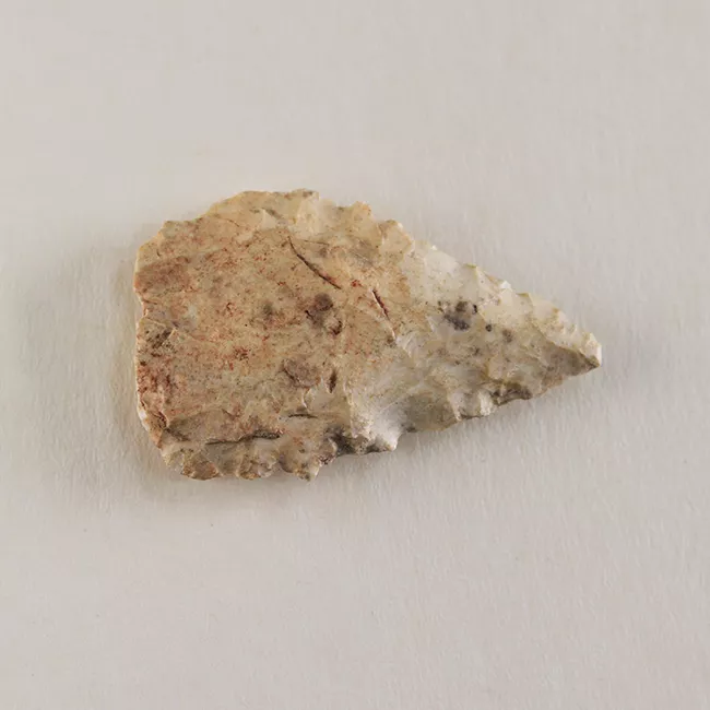 Contenedor abierto de perfil simple. Tiene labio redondeado, cuerpo hemisférico y base convexa. La superficie externa está engobada de color rojo oscuro. La superficie interna está pintada de color blanco y tiene decoración en forma de dos bandas pintadas de color rojo que se cruzan en el centro, con triángulos contrapuestos y enganchados, rombos y triángulos. Presenta además cuatro triángulos reticulados en pintura lineal roja ubicados de forma equidistante entre las bandas. Cerámica modelada, alisada, pulida, engobada y pintada.