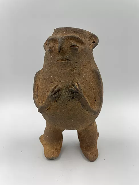 Objeto de piedra con forma redondeada, color café con tonos rojizos, que muestra desgaste por golpe.