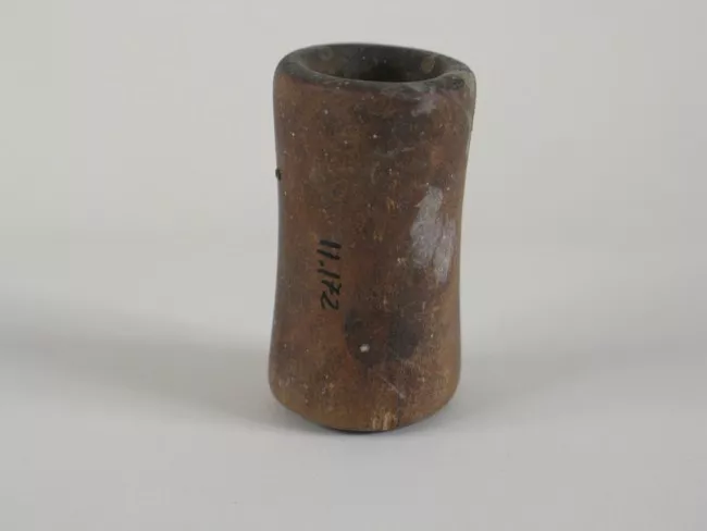 Herramienta lítica utilizada como cabeza de proyectil arrojadizo durante la caza. Tiene cuerpo ovalado y base plana. Talla bifacial con retoque bimarginal continuo. Color rojo oscuro.