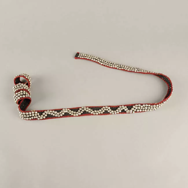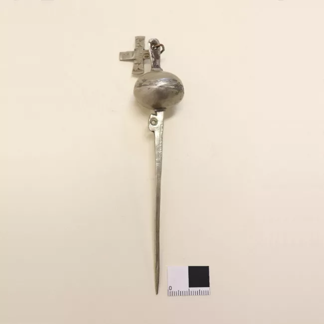 Disco convexo de baquelita. Presenta dos agujeros dispuestos linealmente en la parte central para sujeción mediante costura. Color blanco amarillento.