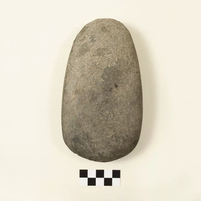 Artefacto elaborado en un guijarro algo aplanado en roca basáltica, la pieza toma su forma a través de lascados en una de sus caras, la otra conserva la corteza de la piedra.