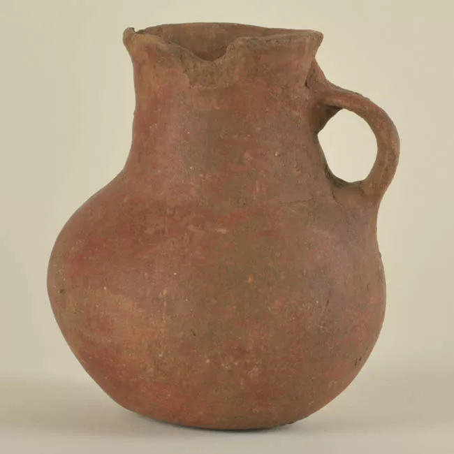 Vasija asimétrica restringida con cuello. Cuerpo subesférico y cuello cilíndrico de borde evertido y labio plano a redondeado. Base plana y circular. Posee un asa vertical de cuello a cuerpo. Presenta una fractura en la zona donde comienza el asa.