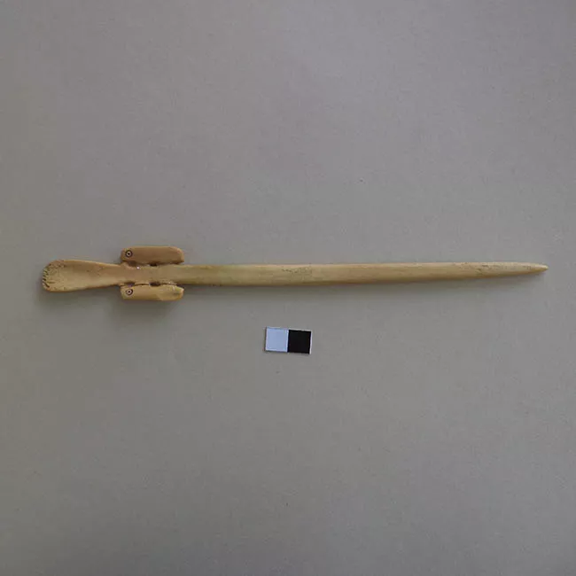Figura antropomorfa tallada en madera. De cuerpo esquematizado, con los brazos incisos a lo largo de los costados del tronco. Rostro con rasgos rectangulares y prominentes en arcos superciliares, nariz, orejas y mentón. Color marrón.