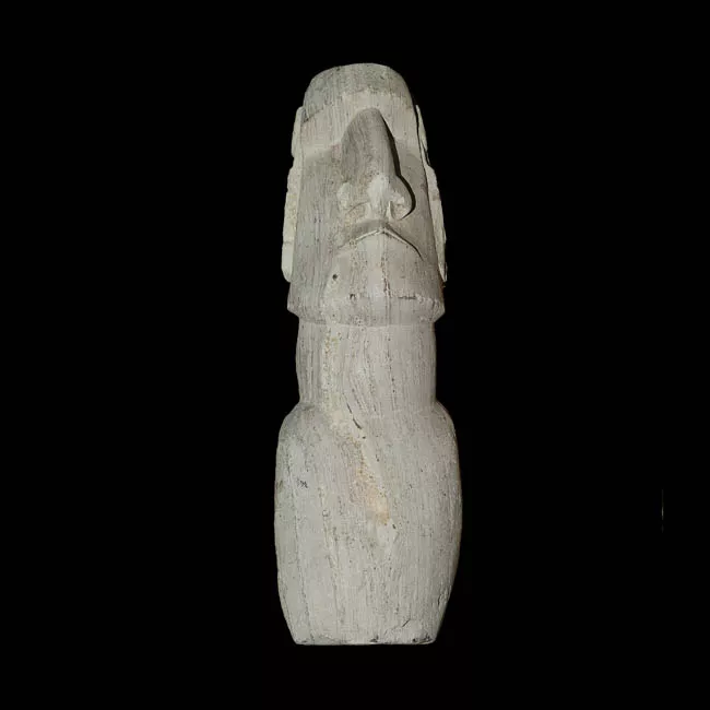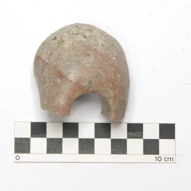Pieza horadada y pulimentada de forma irregular, fabricada de roca den...