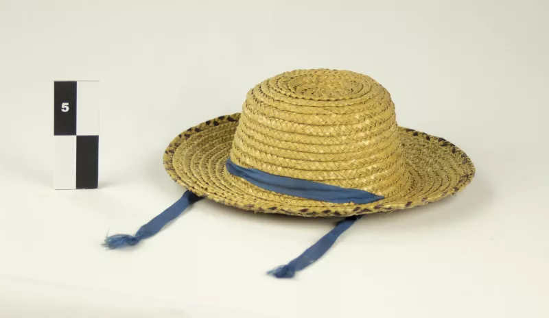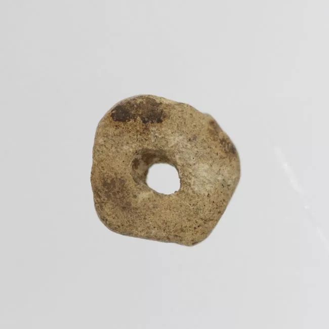 Figura metálica de tonalidad dorada y diseño antropomorfo. Su forma simula ser un individuo masculino, únicamente con detalles en la cabeza de la pieza (ceja y nariz)