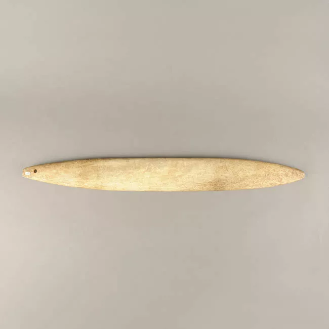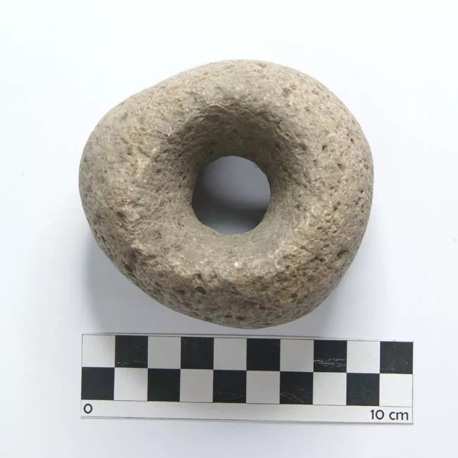 Pieza de color gris claro con inclusiones claroscuras, porosa, globula...