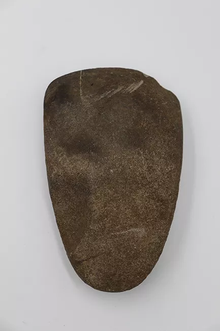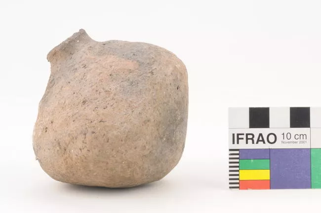 Contenedor cerámico modelado y restringido adscrito al estilo fase o San Miguel. Cuenta con un cuello hiperboloide con borde evertido, un cuerpo esférico o globulary una base plana. Tiene un asa en cinta que supera la altura del labio, unificando a éste último con el sector superior del cuerpo. En cuanto a la decoración, posee un recubrimiento general color crema, sobre la cual se dibujan, lineas que separan segmentos decorativos en forma de anillo, hechas en pigmento negro (motivo a), se observa un patrón sucesivo de rombos concentricos sobre el cuello, en pigmento negro (motivo b), también un acerruchado en negro (motivo c), le siguen motivos de espirales u olas contrapuestas o complementarias, en negro y rojo (motivo d), por donde se esboza el motivo de acerruchados; sigue un patrón sucesivo de rombos en negro con secuencia interna de lineas diagonales paralelas con color alternado en rojo y negro (motivo e). El asa se encuentra decorada por su lado externo con lineas paralelas en negro dispuestas de forma horizontal (f). El sector inferior de la pieza no se encuentra decorado.