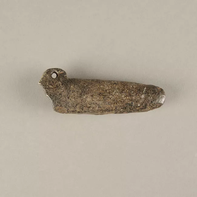 Instrumento aerófono de cerámica. La pieza presenta un cuerpo alargado y macizo, de sección subrectangular a ovalada, con un extremo superior redondeado. El extremo inferior se ensancha conformando un volumen más ancho e irregular en donde se ubica la perforación circular y profunda que permite la emisión del sonido. En la zona media del cuerpo se observan dos perforaciones laterales opuestas, dispuestas simétricamente en las protuberancias del cuerpo. La superficie presenta acabado alisado irregular, con evidencias de manufactura manual e inclusiones de tamaño mediano a grueso.