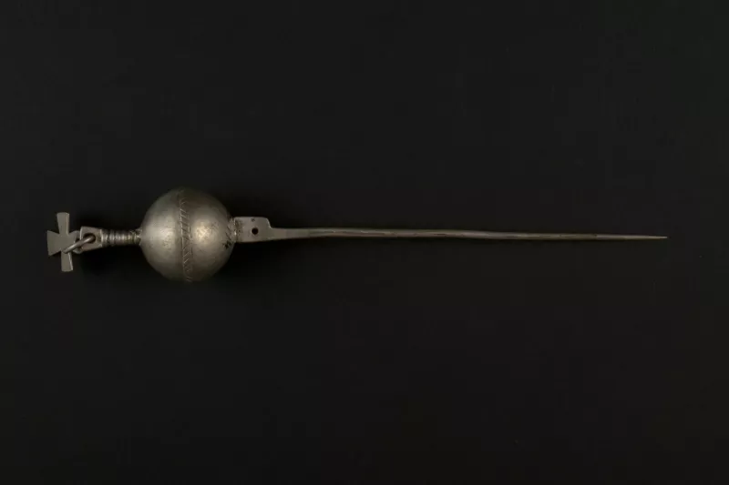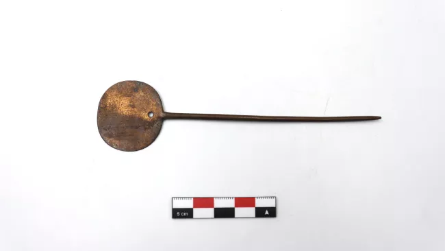 Adorno de uso personal femenino que se usa en el pecho. Está compuesto por cinco placas. La placa superior tiene diseños calados e incisos que representan dos aves enfrentadas. Se encuentra perforada en los extremos y en el centro, penden tres series dobles de cinco cadenas. Las placas intermedias son ovaladas en los extremos y cuadrada en el centro. La placa inferior es cuadrada y tiene un rostro humano en relieve en la parte superior; se encuentra perforada con cuatro pendientes cruciformes.