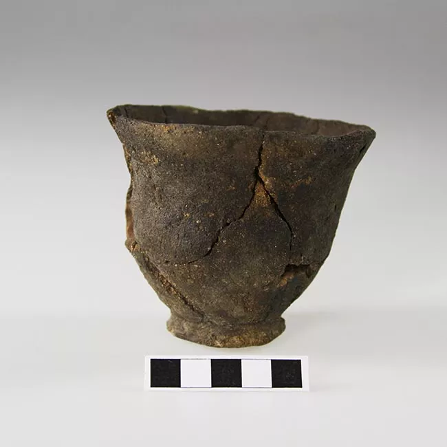 Instrumento lítico de forma ovoidal regular, de bordes redondeados rematados en una superficie plana, posee una perforación gradual en el sector central. En la superficie inferior de la piedra presenta la inscripción "00276" de fondo blanco y escrito negro.