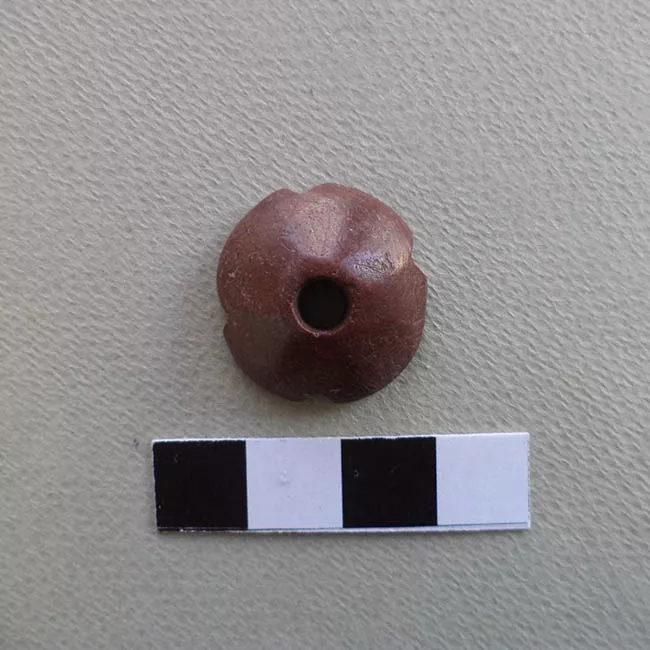 Objeto de uso doméstico de talla bifacial, elaborado en sílice opaco de color gris claro con vetillas gris oscuro de forma triangular apedunculada, de base escotada con aletas y sección biconvexa.