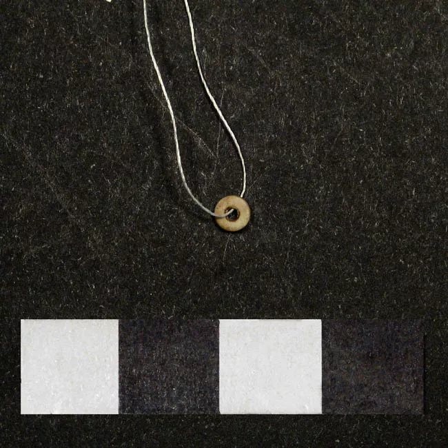 Cuenta de forma trapezoidal, de bordes rectos y biselados, realizada sobre lítico. Posee una perforación circular de 2,5 mm de diámetro en uno de sus extremos, mientras que en el otro posee la marca de un intento de perforación. Superficie tallada y pulida, de color celeste verdoso. Se observan huellas de manufactura.