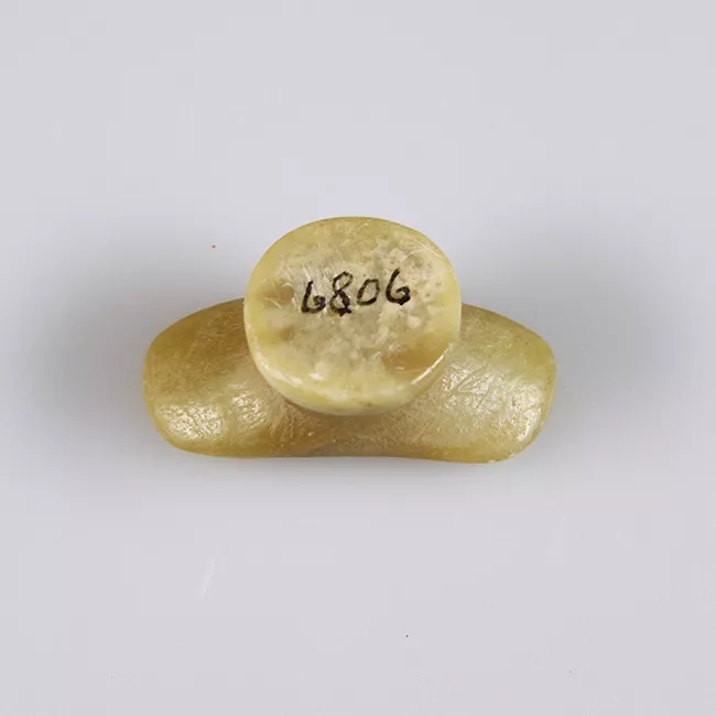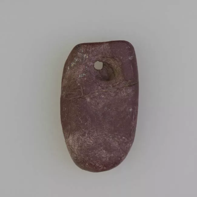 Objeto ornamental de uso personal de forma elipsoidal, sección transversal plana y perforación central cónica. Elaborado en andesita de color gris con inclusiones blancas y negras.