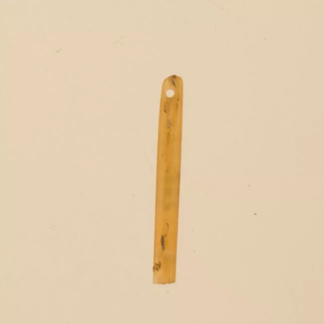 Artefacto plano elaborado en hueso largo pulido, correspondiente a un colgante. Se compone de un cuerpo subelipsoidal, con un apéndice elipsoidal donde está realizada una perforación bicónica con el objetivo de pender.