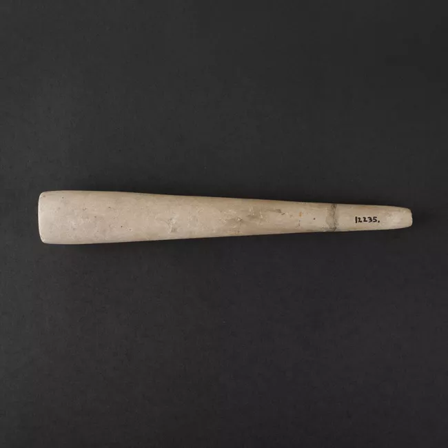 Objeto de uso ritual. Figurilla zoomorfa de concha de Spondylus sp. o Mullu (molusco bivalvo propio de las costas de Ecuador), con forma de camélido esquemático en que se distinguen sus extremidades, cola y cabeza con todos sus rasgos en ambos lados de la pieza en forma simétrica.