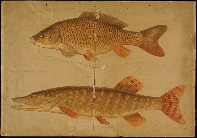 Personaje masculino barbado sobre escalera, realizando acción de aventar algo, enfrente de él personaje en posición de esquivar, sobre su cabeza una lanza enterrada en un muro, caído al lado, una especie de banca y un instrumento de cuerdas.