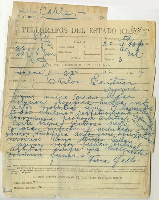 Telegrama de Iquique posterior a matanza en Escuela Santa María, dirigida al intendente Carlos Eastman