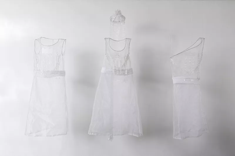 Instalación de tres vestimentas tradicionales mapuche elaboradas con m...