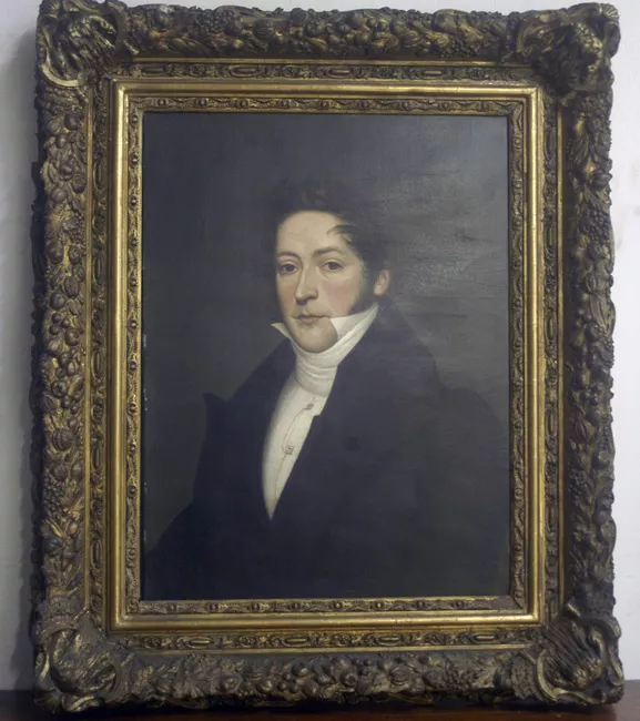 Obra de formato rectangular con marco dorado, en la cual se representa...