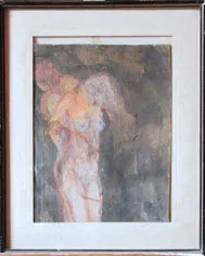 Obra de formato rectangular. Retrato de figura femenina, sentada en sillón con respaldo capitoné. Vestida de negro, fondo cortina de color granate por una pequeña ventana se observa un paisaje urbano. Lleva marco dorado.
