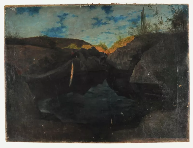 Obra de formato rectangular. Composición en base a paisaje urbano comp...