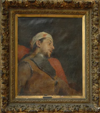 Retrato de busto de un hombre, del perfil derecho, sobre fondo neutro ...