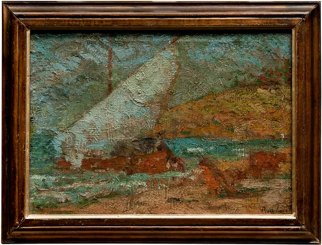 Obra de formato rectangular. Composición en base a un bote de vela a l...