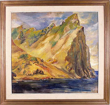 Obra de formato rectangular. En primer plano una pileta con una figura masculina de niño de color dorado. En segundo plano tres árboles, uno de color verde claro con tonos amarillos y los otros dos en color verde oscuro.