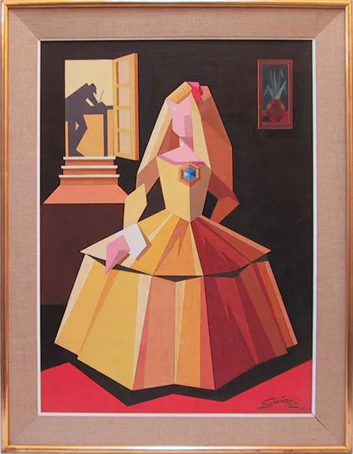 Obra de formato rectangular. Composición en base a paisaje rural con figura femenina de una niña, de tres cuartos, de cabeza en perfil y cuerpo en medio perfil. La figura lleva falda de color café claro, blusa en color ocre y sobre los hombros un chal en color terracota. En su mano derecha sostiene un jarrón de color café oscuro, su mano izquierda está cerca de la boca y sostiene una fruta que apoya sobre sus labios. Detrás de ella se observa la tierra y césped. En el fondo una casa de color blanco con techo café claro y una puerta al extremo derecho en la cual se observa una figura femenina sedente. Al lado izquierdo de la casa una pared en colores café, ocres y terracotas y el cielo nuboso en color blanco y tonos grises. Lleva marco de madera con detalles en relieve dorados.